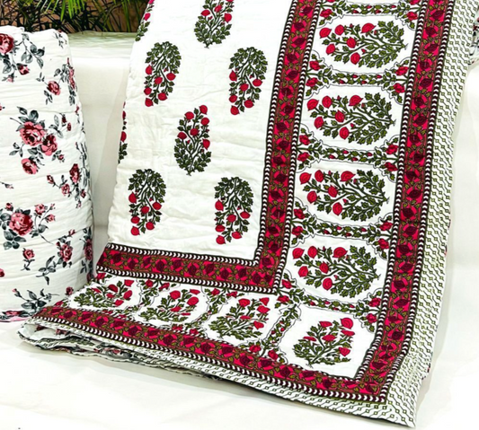 Indian Block Print King Size Reversible Hand Quilted Comforter in Red