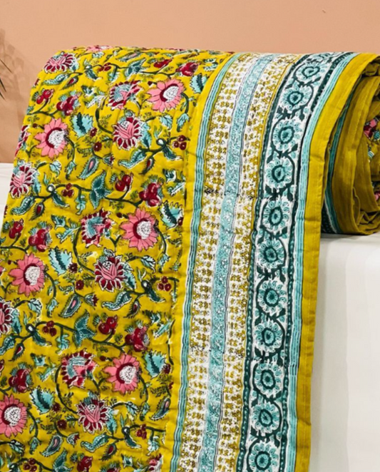 Soft cotton Block Print King Size Reversible Quilted Comforter / Dohar - Yellow