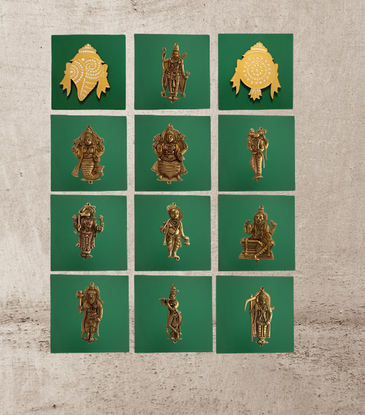Handpainted Wooden Wall Decor Set – Dashavatar Brass Frames (Set of 12)