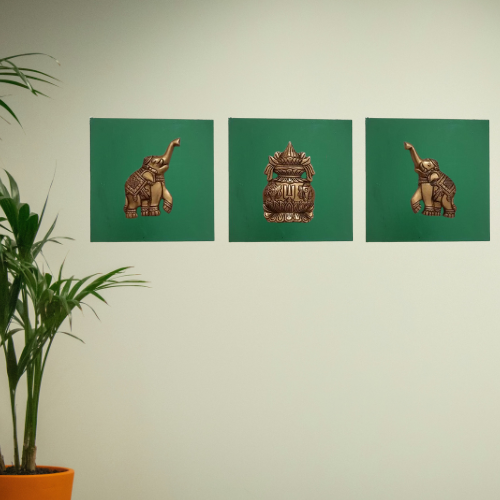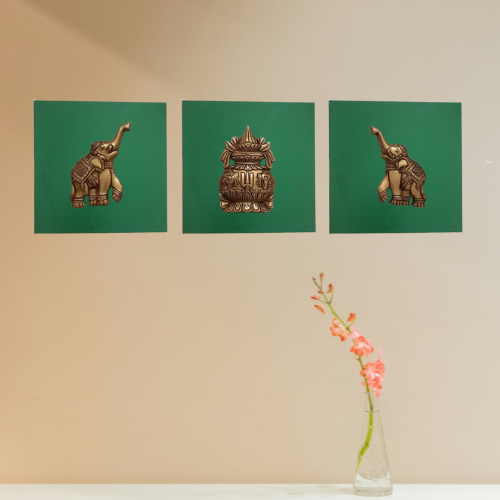 Enhance your home’s spiritual and aesthetic appeal with this stunning handpainted wooden wall frame, featuring a brass Kalash in the center and two brass elephants on either side. This traditional Indian wall hanging is a symbol of prosperity, protection, and cultural richness, making it ideal for any sacred or decorative space.