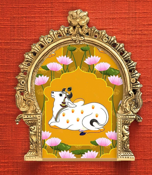 Add elegance to any wall with this wall decor and redefine your space.. This art work is part of our prabhavali collection. An Indian art digitally printed and embellished with Brass Prabhavali & rich vibrant raw silk backdrop. Borders on this frame(kolam borders) are made of 24 carat gold coated wafer thin metal.