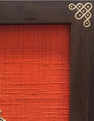 An Indian art digitally printed and embellished with Brass Prabhavali & rich vibrant raw silk backdrop. Borders on this frame(kolam borders) are made of 24 carat gold coated wafer thin metal.