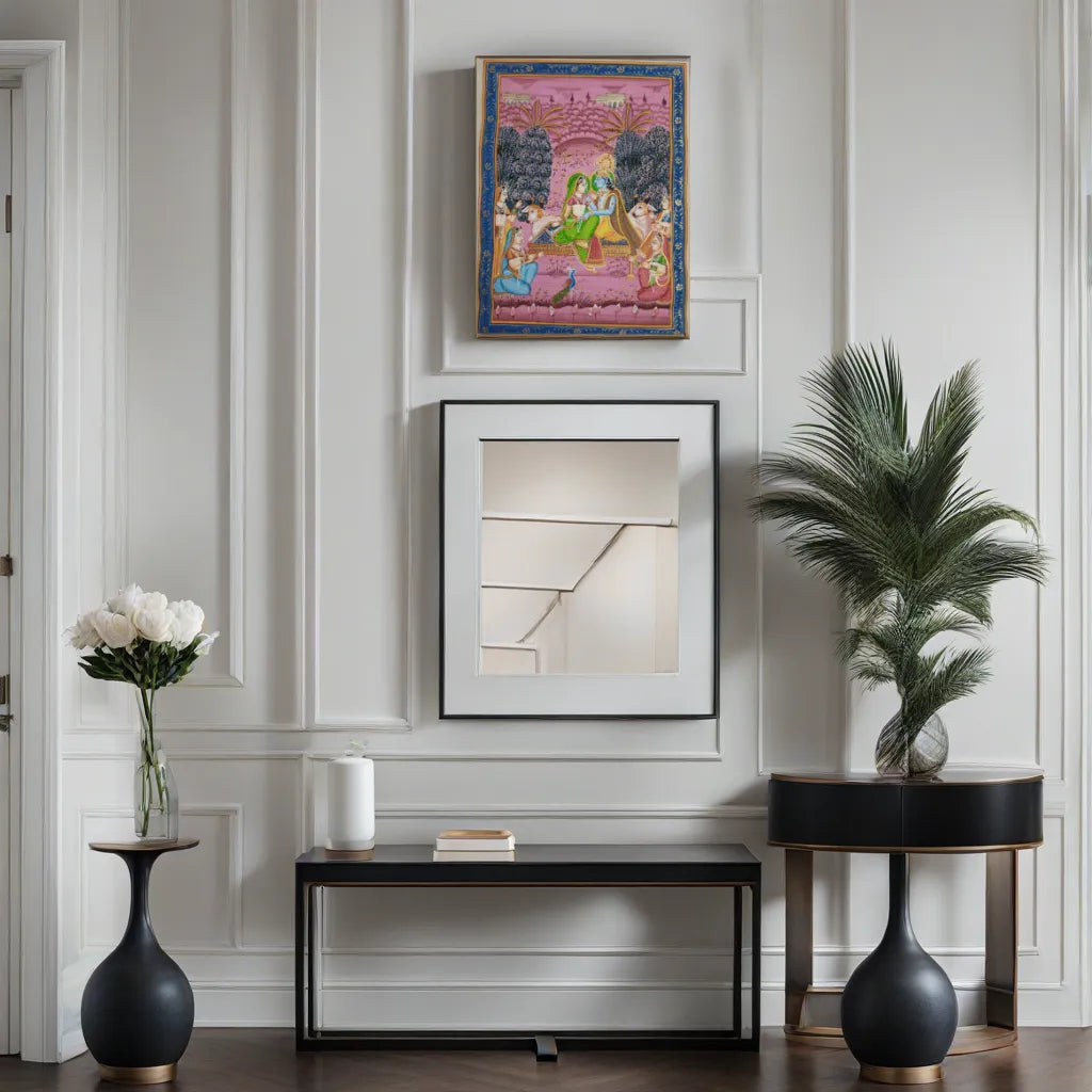 The artwork features a handmade painting on silk poster cloth. This painting represents Hindu deity Shri Radha and Shri Krishna being seated on a throne.